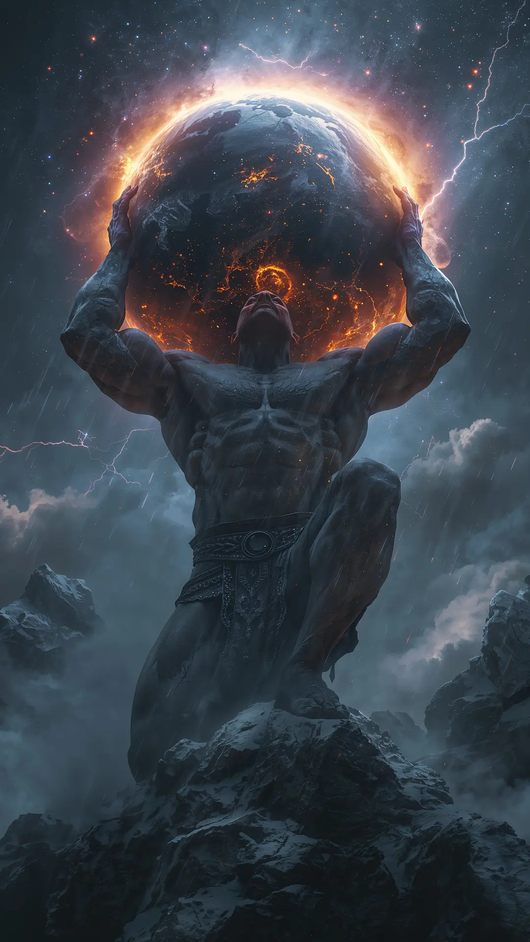 A monumental depiction of the Titan Atlas, condemned to an eternity of bearing the celestial heavens. Kneeling upon a jagged, frost-bitten mountain peak, his immense physique is strained under the weight of a glowing, molten world. The atmosphere is thick with the electricity of a cosmic storm, where lightning fractures the dark, swirling clouds and rain-slicked stone reflects the fiery internal glow of the orb above. The scene captures a profound sense of mythological burden and celestial power. Every muscle is etched with the tension of an ancient struggle, while the surrounding universe bleeds into the atmosphere through shimmering stardust and ethereal light. It is a moment of eternal stillness amidst a tempest, portraying the sheer scale of a mythic figure caught between the earth and the infinite reaches of the cosmos.