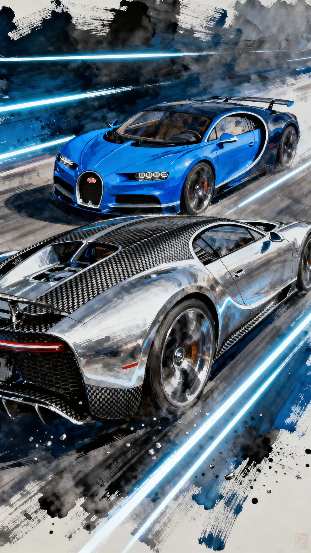 The Bugatti Tourbillon in Kinetic Blue and Silver is showcased with aggressive brushstrokes and powerful motion blur. Anisotropic highlights on the carbon fiber and streaked white neon speed trails define the hypercar's futuristic and ultra-detailed design. The layered paint saturation and visible ink bleed convey a sense of extreme velocity and technical mastery.