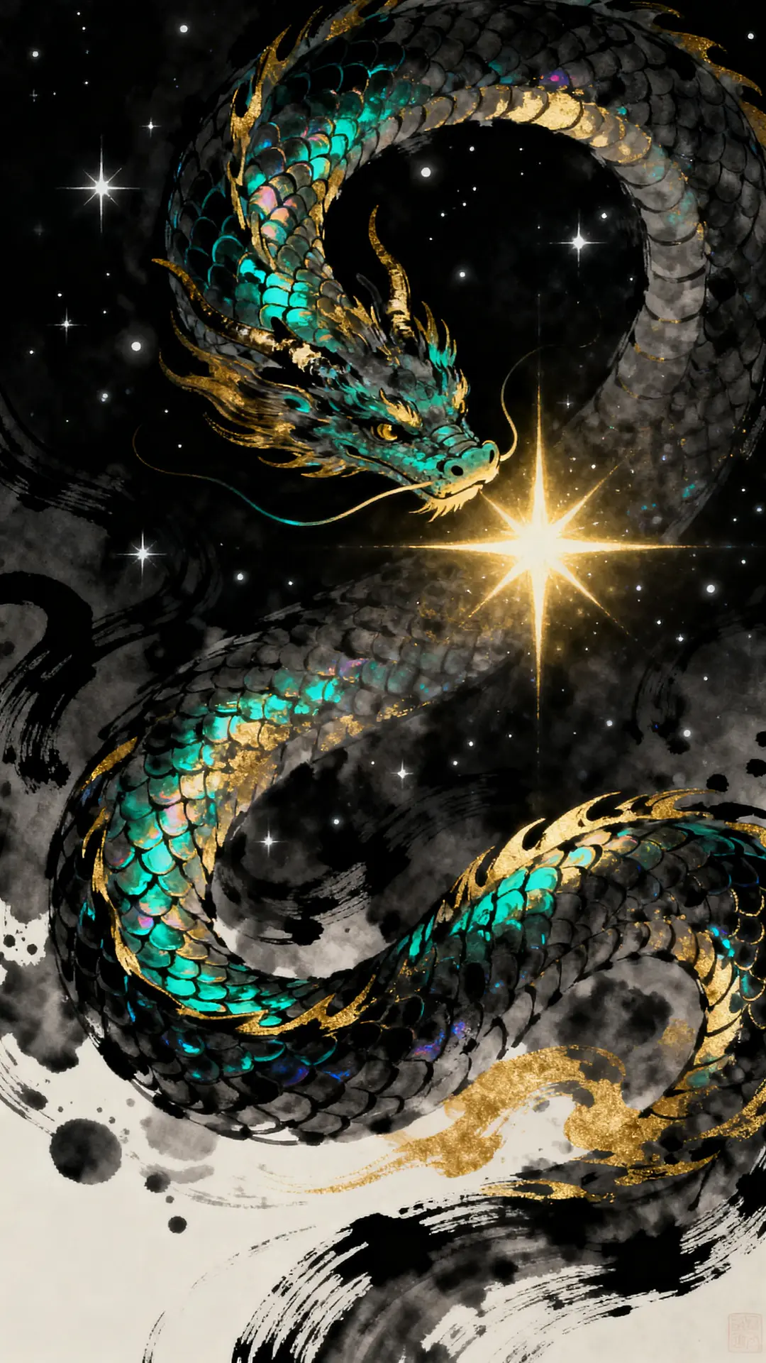 A graceful Chinese Serpent coils around a pulsating star, its iridescent oil-slick scales reflecting the stellar void. The composition features heavy strokes and fluid movement, rendered in a palette of obsidian black, teal, and gold. Lighting diffusion and sharp vector precision emphasize the environmental density of this cosmic entity.