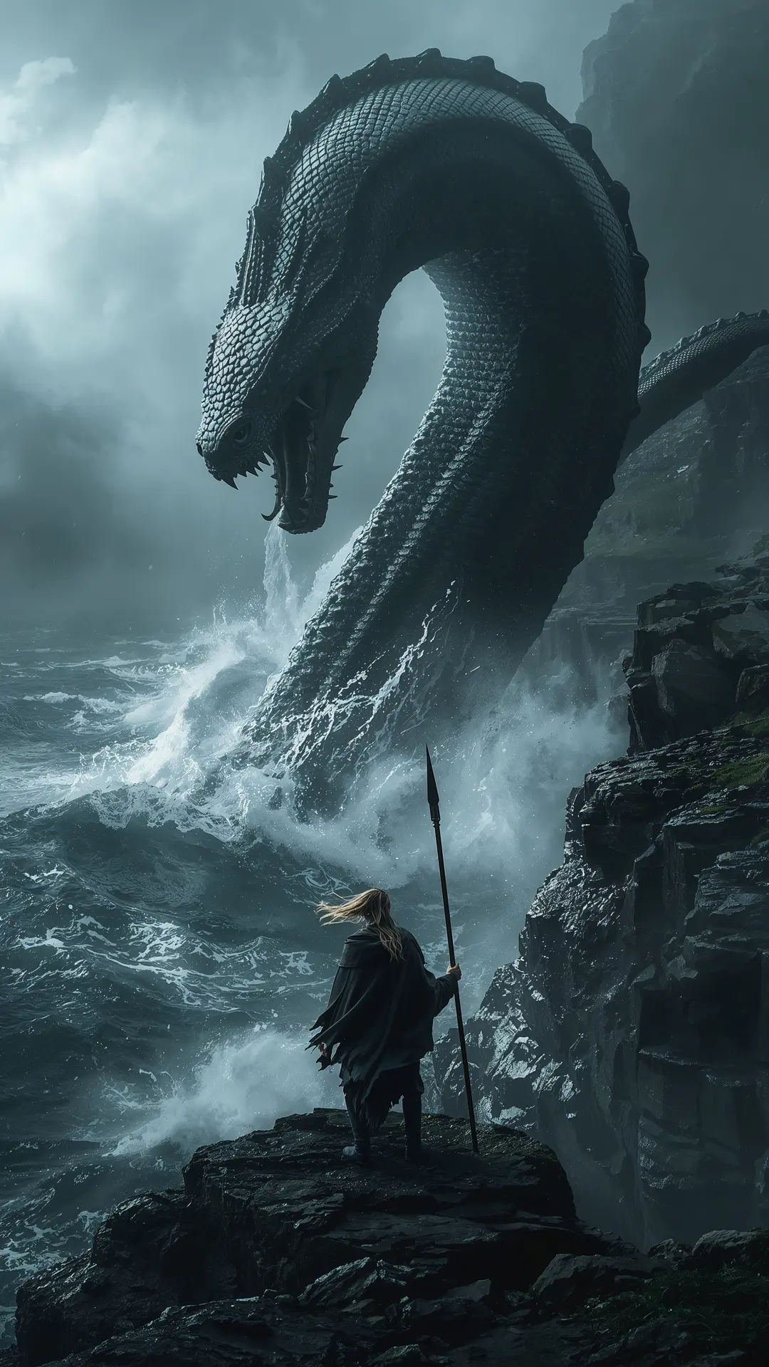 Cú Chulainn stands firm upon jagged cliffs as the colossal Oilliphéist serpent rises from a stormy Celtic lake. Water cascades from the massive monster's scales while wind whips through the warrior's hair amidst thick volumetric spray. Cinematic lighting and dark fantasy realism capture this epic moment of ancient Celtic folklore.