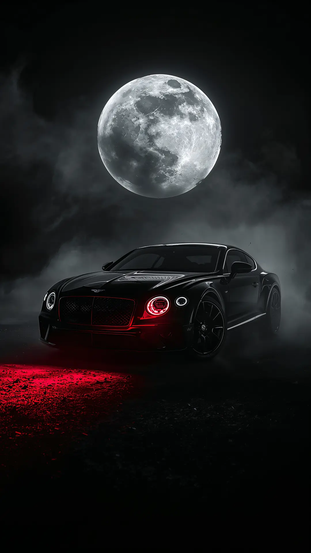 A custom Bentley Continental GT is silhouetted against a massive, glowing full moon in a dark, mystical ronin aesthetic. Fierce crimson-red light emanates from the grille and wheel hubs, casting a blood-red glow onto the swirling atmospheric fog. Hyper-detailed metallic edges catch the cold moonlight in this dramatic noir masterpiece.