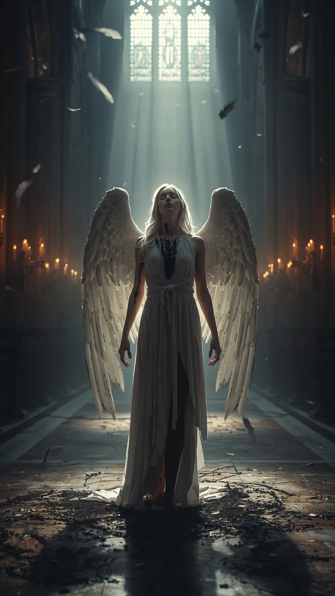 A fallen angel stands with broken, skeletal wings amidst the fog of a crumbling cathedral nave. Her pale skin is marked by dark veins of corruption, contrasting with the tattered white robes draped over her frame. Soft candlelight and dusty stained-glass beams illuminate this melancholic and sacred scene of eternal regret.