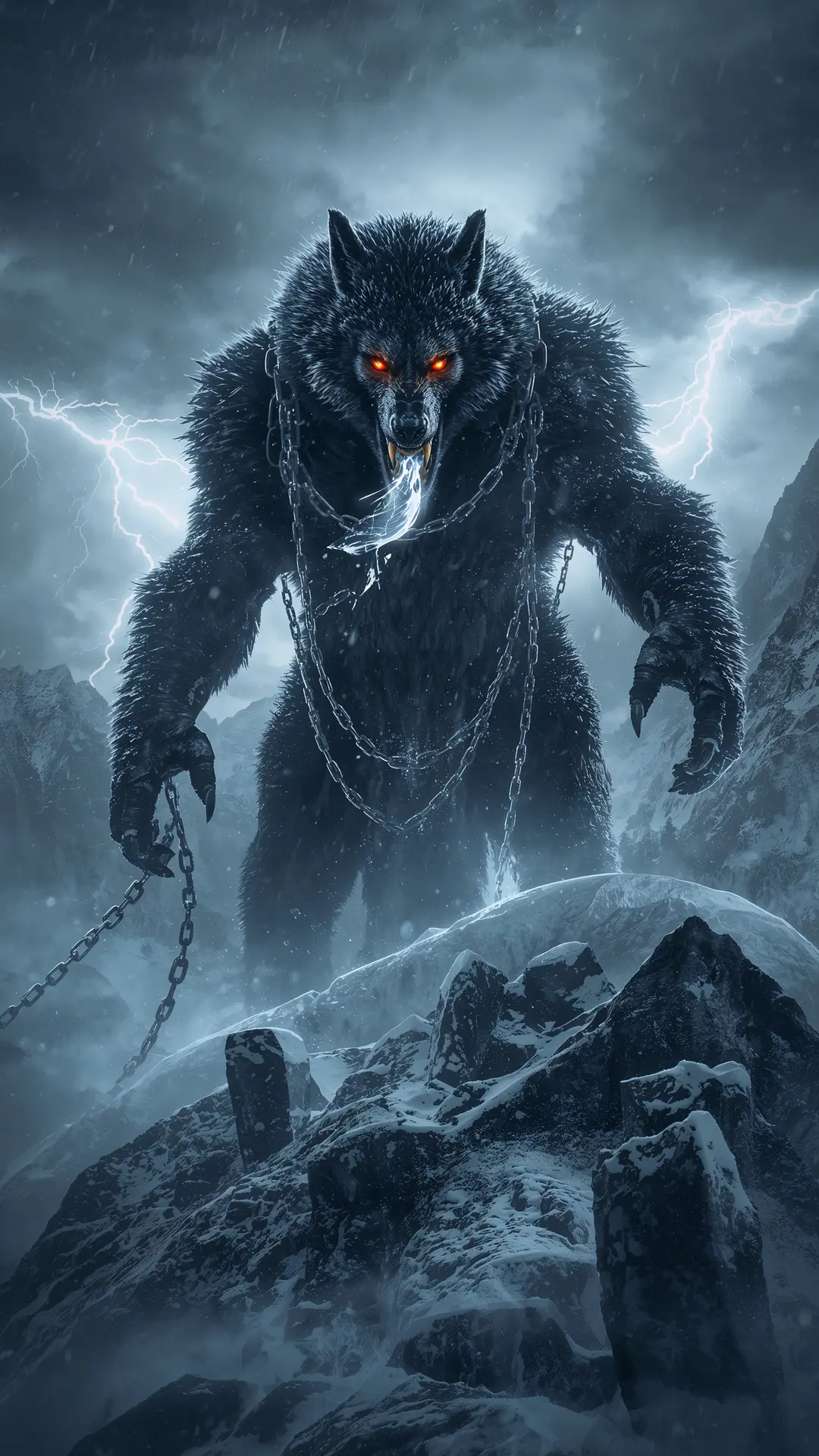 The colossal wolf Fenrir stands atop a frozen mountain peak beneath a stormy Nordic sky. Broken chains hang from his legs as glowing amber eyes burn with primal rage amidst a swirling snowstorm. Ancient runic stones are scattered across the icy landscape, radiating an atmosphere of unstoppable power and ancient fury.