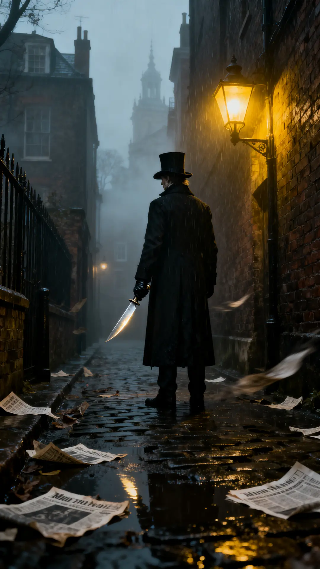A mysterious figure in a dark overcoat and top hat looms at the end of a fog-covered Victorian alley. Gas lamps flicker against brick walls and rain-slicked cobblestones, while a polished surgical knife glints in the shadows. This eerie and suspenseful scene evokes the chilling atmosphere of 1880s London with cinematic lighting and volumetric mist.
