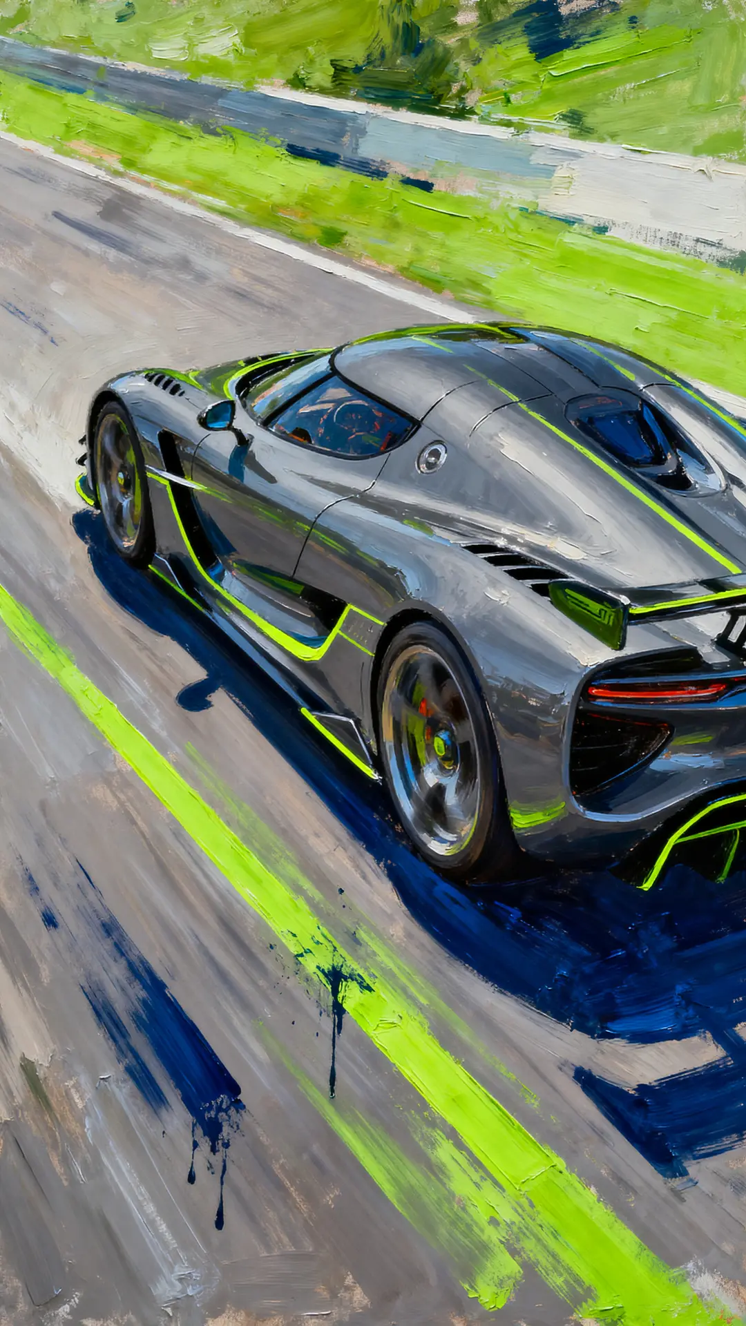 A Koenigsegg Jesko Absolut in Graphite Grey is depicted with powerful sweeping brushstrokes and aggressive motion blur on its long-tail chassis. Streaked lime green speed trails and deep indigo shadows emphasize the world's fastest car's extreme velocity. Sharp diagonal neon lines and visible ink bleed define the hypercar's technical complexity and raw high-speed potential.
