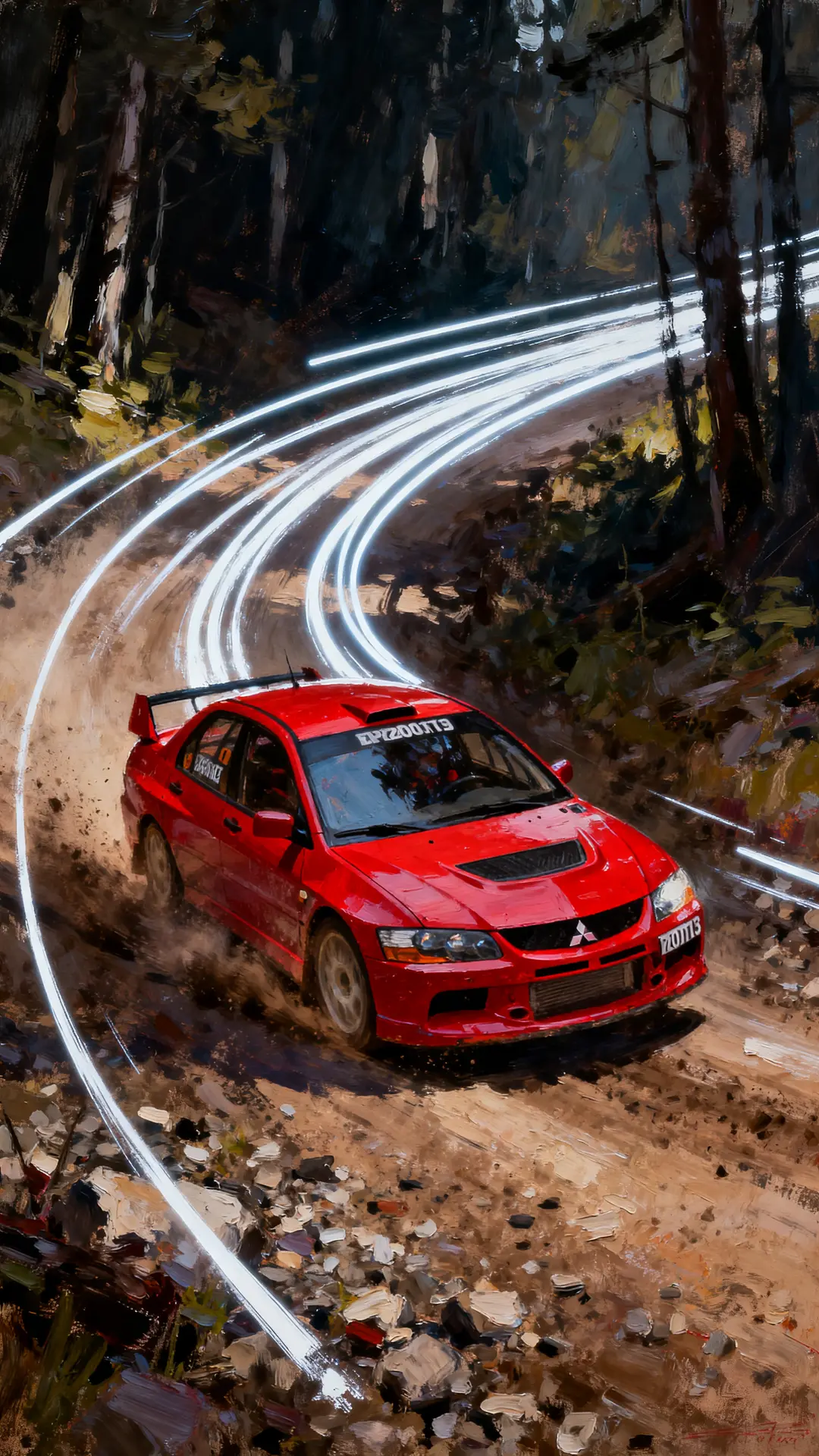 The Mitsubishi Lancer Evo VI TME in Passion Red charges through a rally course with violent expressive brushstrokes and heavy motion blur. Dirt and gravel environmental density add to the raw energy of the scene, highlighted by streaked white neon speed trails. High-contrast forest shadows and sharp diagonal lines emphasize the rally icon's legendary status.