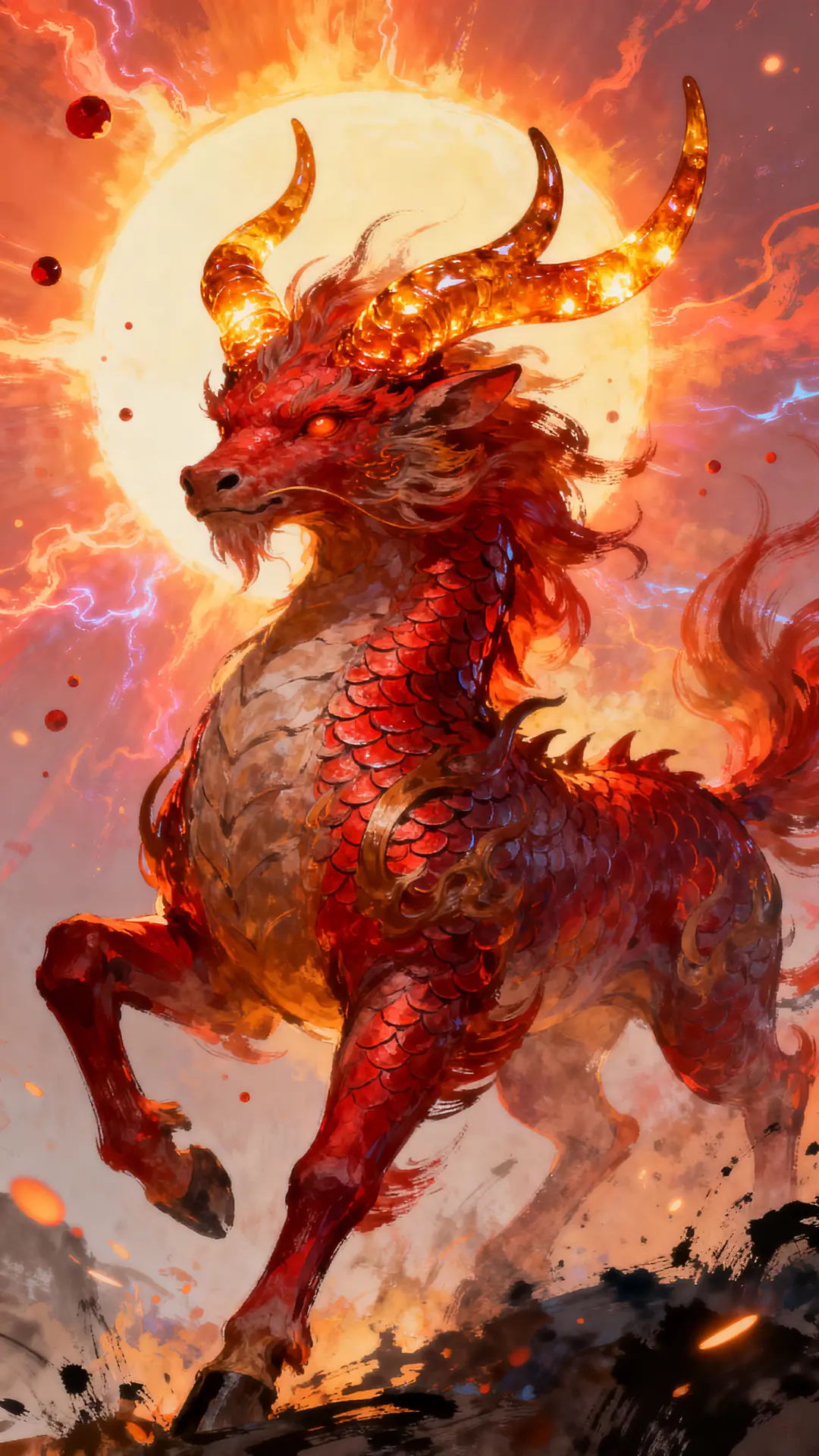 The legendary Qilin is captured against a backdrop of intense solar flares in an amber and crimson palette. Radiant lighting and plasma effects emphasize the high-temperature Kelvin scale, with subsurface scattering on its horns. Heavy ink strokes and solar particles create a cinematic composition with ultra-high environmental density and detail.