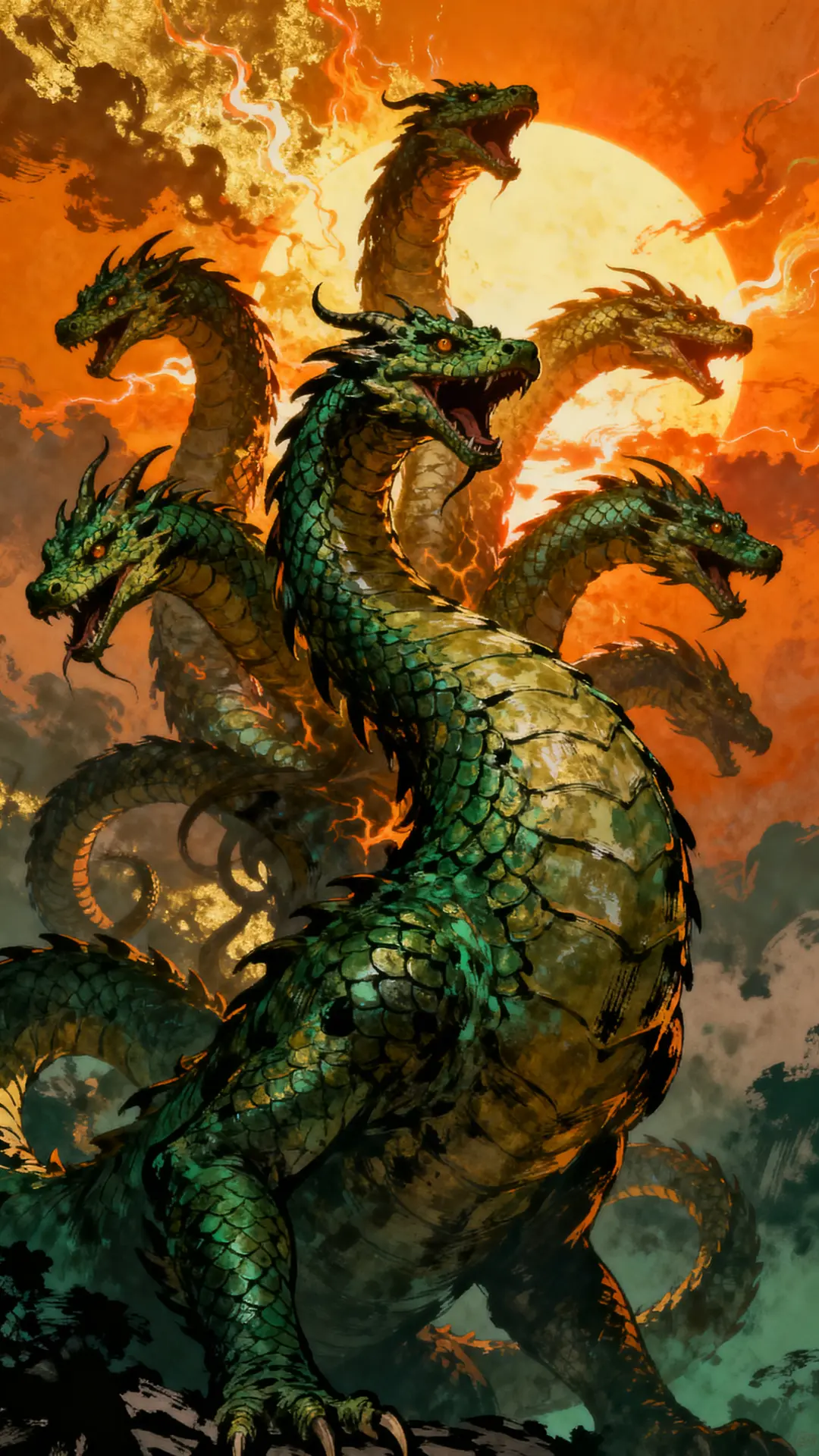 A multi-headed Hydra coils around a dying sun, its many eyes glowing with intense solar heat. The artwork utilizes heavy ink saturation and visible strokes to define the reptilian scales and the swirling plasma of the star. Atmospheric lighting creates a spatial scale of massive, overwhelming proportions.