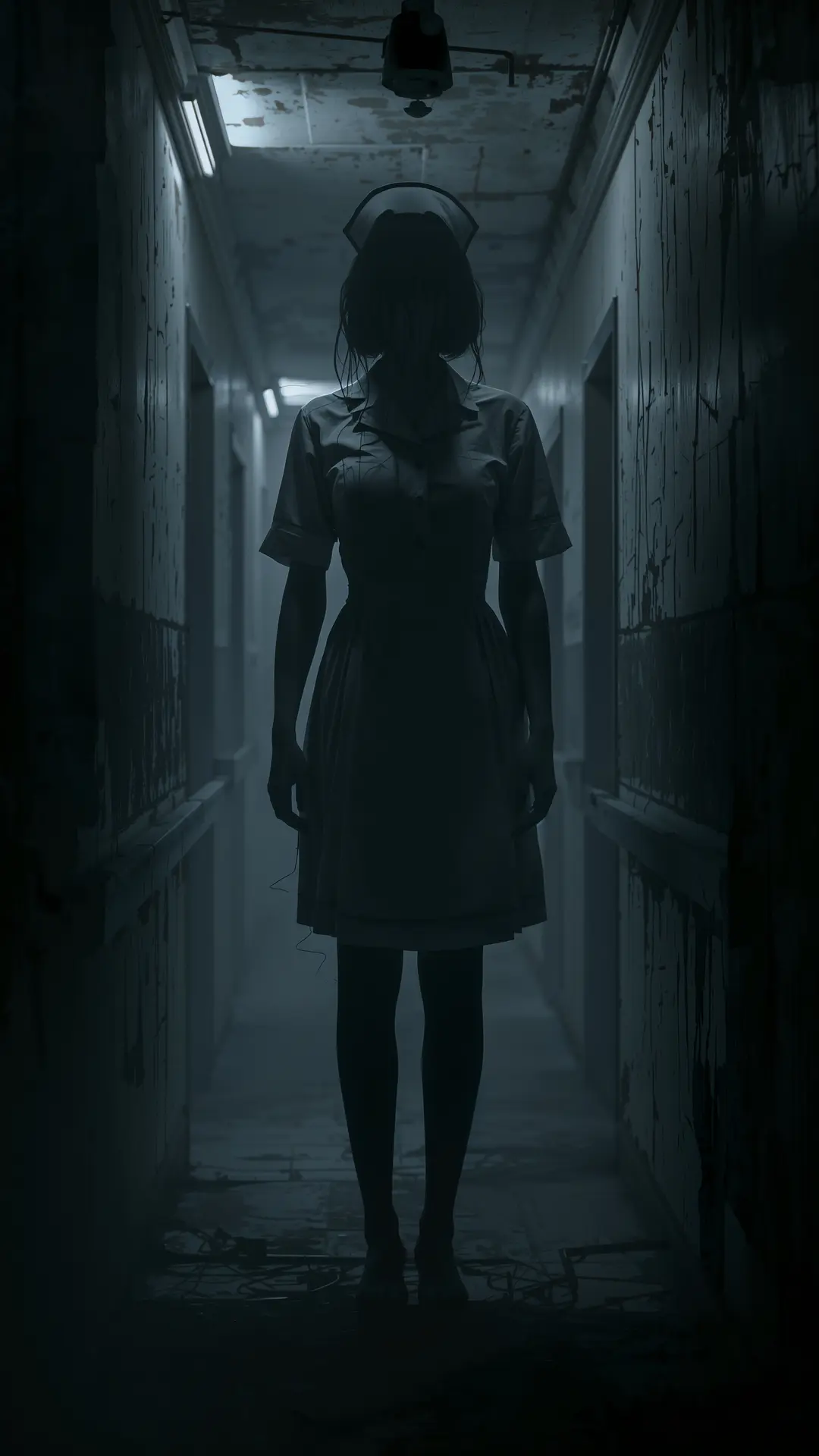 A tall, distorted nurse figure stands at the end of a decaying hospital corridor, her face obscured by shadow and cracked porcelain skin. Flickering fluorescent lights cast harsh highlights against peeling walls as dark tendrils dissolve into the surrounding gloom. This psychological horror scene evokes a sense of sterile decay and endless, grieving waiting.