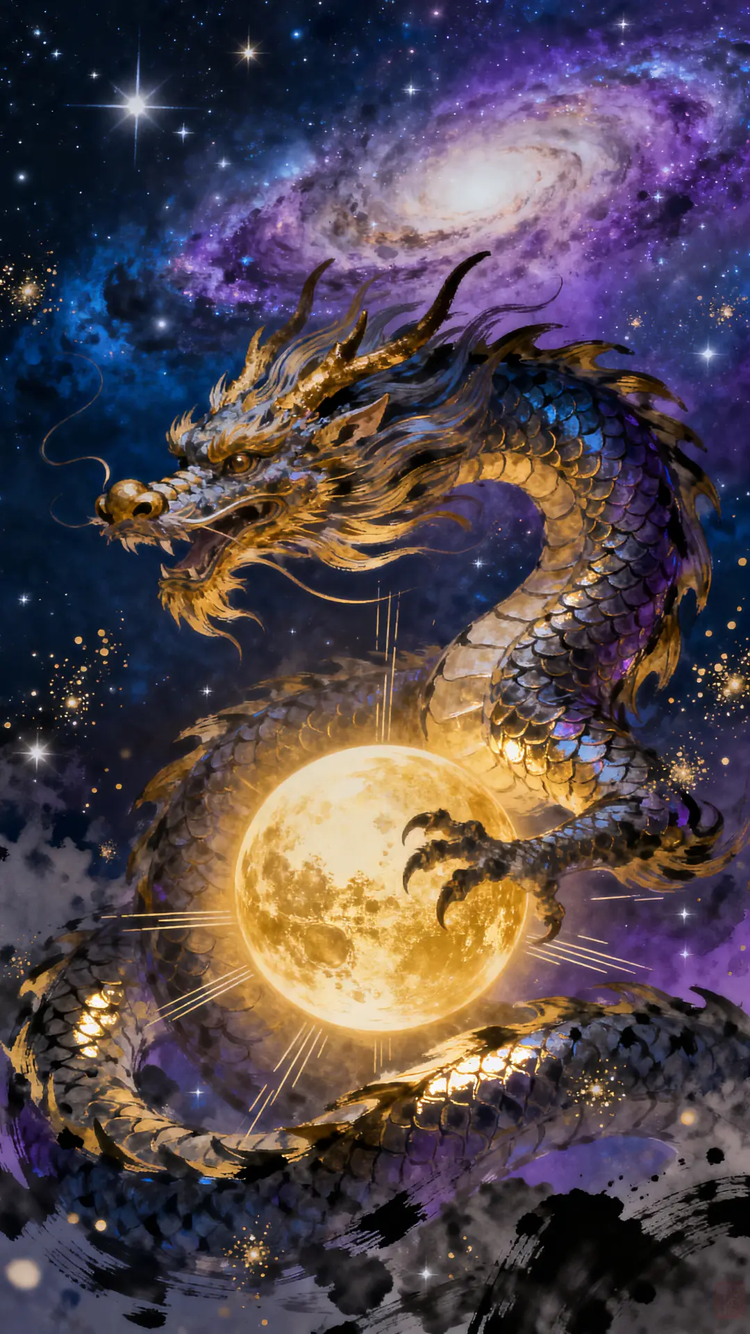 A traditional Chinese dragon winds around celestial bodies against a cosmic galaxy background in high-fidelity detail. Heavy ink strokes and layered saturation highlight the anisotropic reflections on its scales, while volumetric stardust fills the deep cobalt and violet environment. The sharp vector lines and high visual density create an epic, historical sense of power.