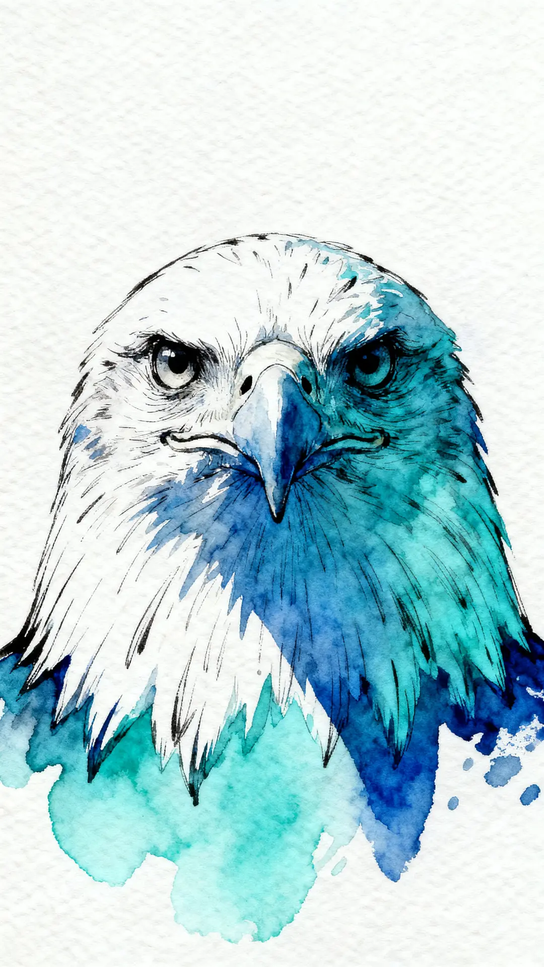 A forward-facing eagle head is detailed with cerulean and turquoise pigment diffusion using a wet-on-wet technique. Sharp indigo shadows and technical ink plumes define the feathers, creating a majestic composition against a minimalist background. The high-resolution artistic rendering captures the piercing intensity and nobility of the bird of prey.