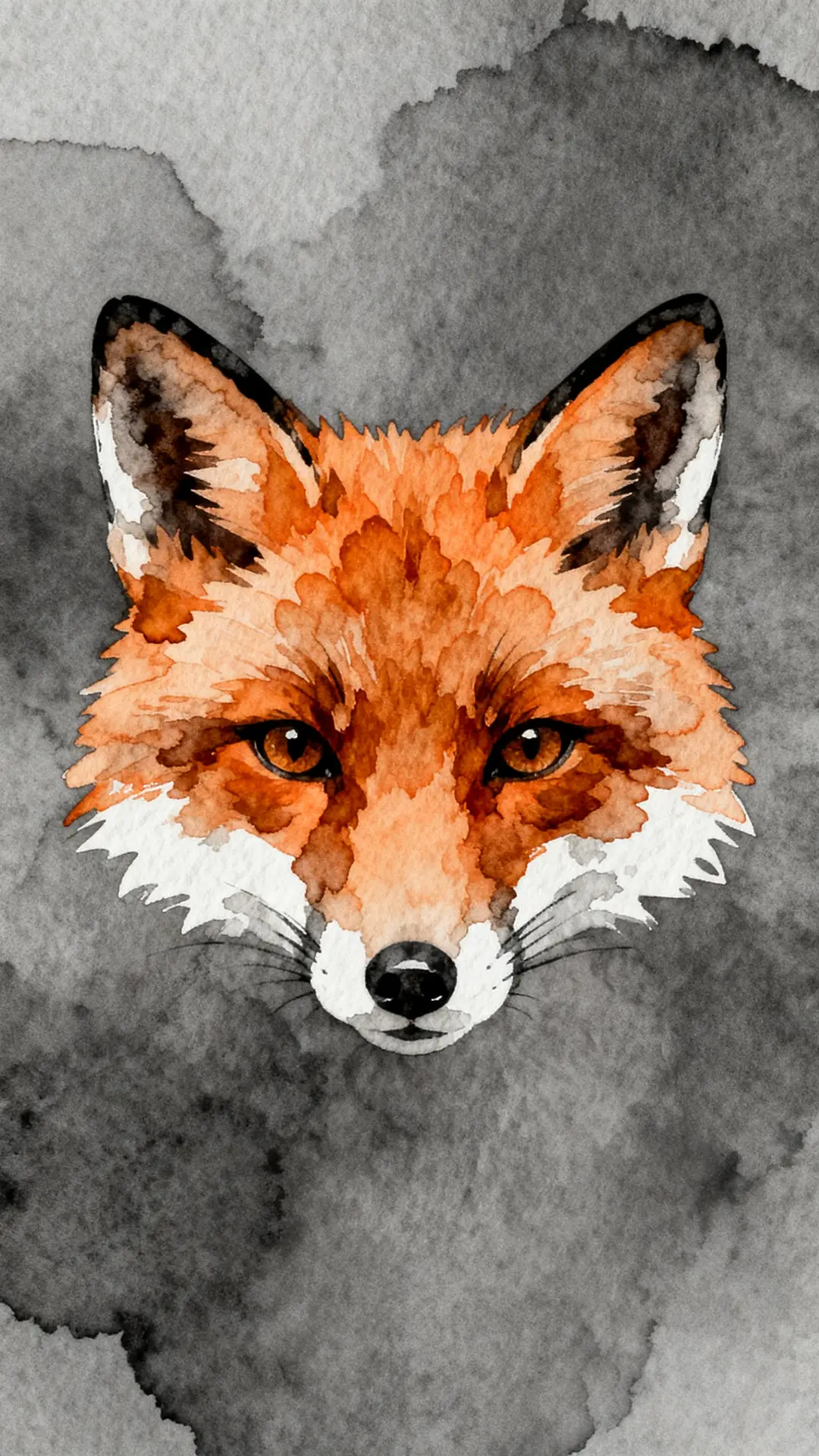 A professional watercolor fox logo is presented in a symmetrical frontal composition with cadmium orange and deep amber tones. Visible paper texture and ink bleed effects enhance the layered pigment saturation and sharp ocular details. The volumetric watercolor blooms and high-fidelity liquid dynamics create a clean, minimalist artistic statement.