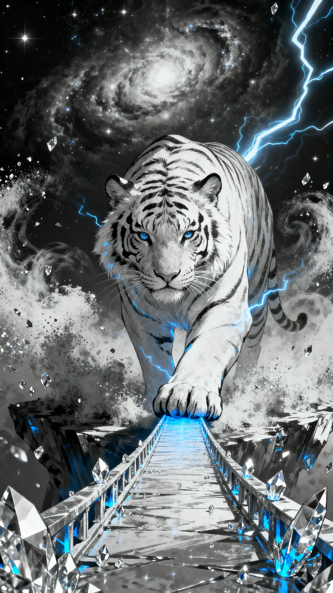 The White Tiger Baihu stands before a supernova background with crystalline dust clouds and an astral bridge. Rendered in monochromatic silver and white with electric blue accents, the tiger exhibits high-fidelity fur textures and sharp vector precision. The high-contrast lighting and environmental depth create a powerful vision of this celestial guardian.